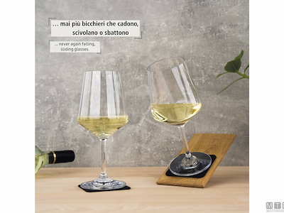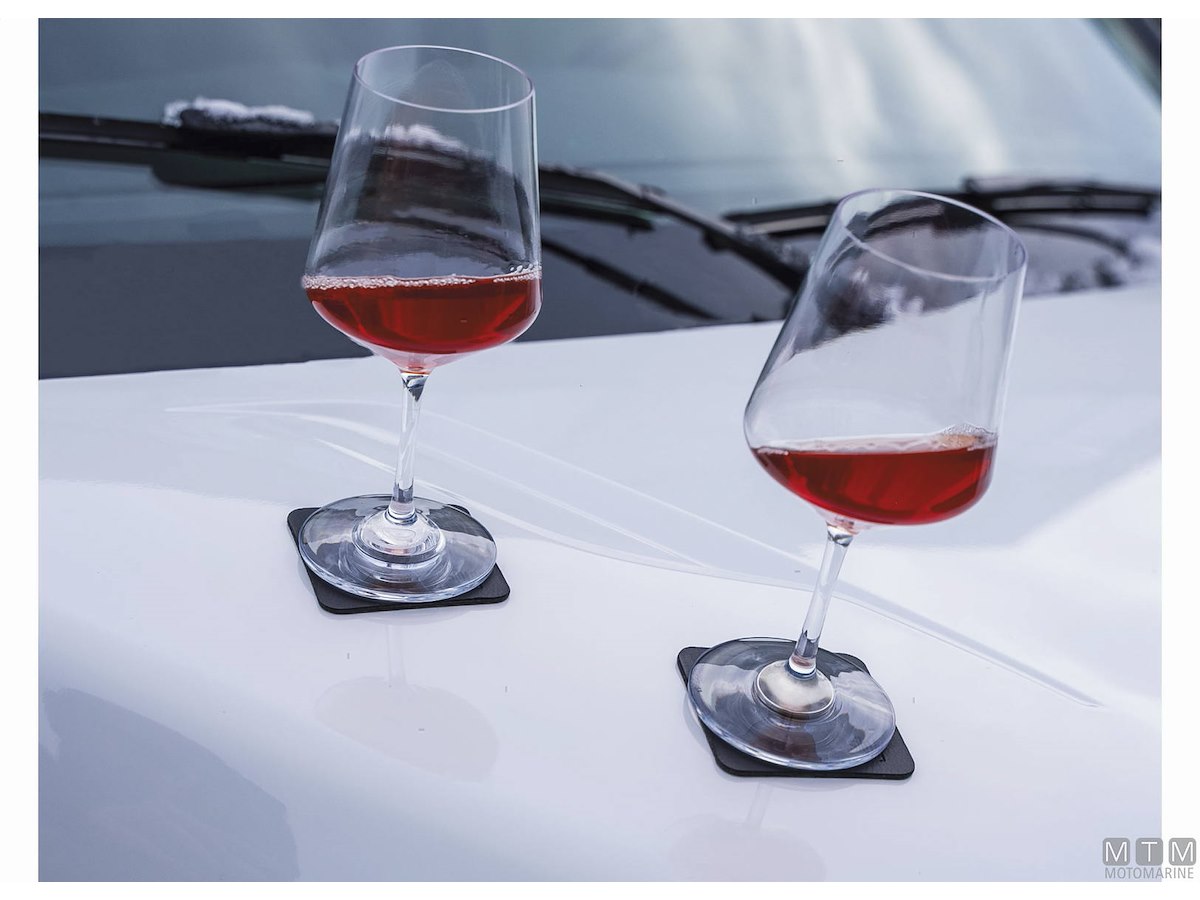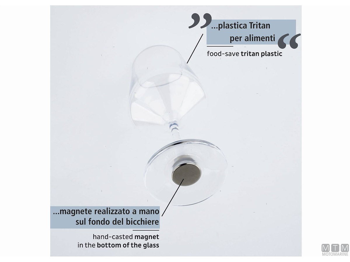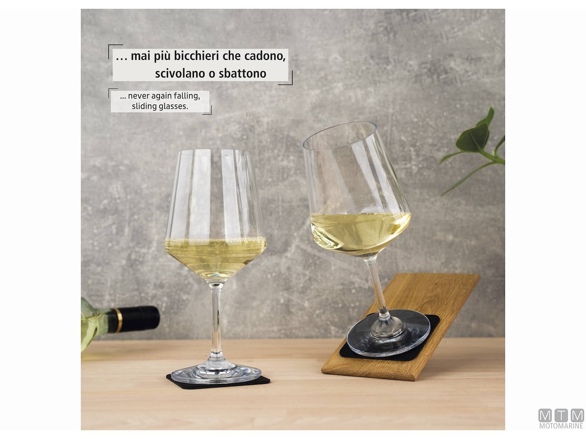Eleganti calici da vino Silwy in plastica di alta qualità con pratici magneti integrati sul fondo che ne rendono sicuro l’appoggio anche quando il mare è mosso. Rapporto di tenuta perfetto tra sottobicchiere e bicchiere. I sottobicchieri metallici in nano-gel sono rimovibili, durevoli, non lasciano residui e aderiscono a tutte le superfici. Forniti in set da 2 bicchieri, compresi di sottobicchieri in nano-gel metallizzati.