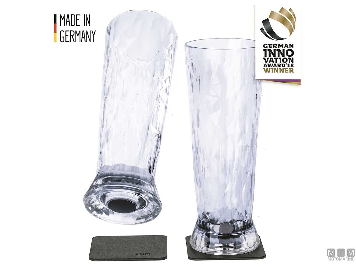 Eleganti calici da birra Silwy in plastica di alta qualità con pratici magneti integrati sul fondo che ne rendono sicuro l’appoggio anche quando il mare è mosso. Rapporto di tenuta perfetto tra sottobicchiere e bicchiere. I sottobicchieri metallici in nano-gel sono rimovibili, durevoli, non lasciano residui e aderiscono a tutte le superfici. Forniti in set da 2 bicchieri, compresi di sottobicchieri in nano-gel metallizzati.