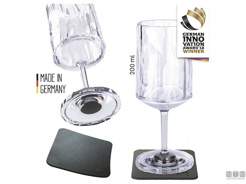Eleganti calici da vino Silwy in plastica di alta qualità con pratici magneti integrati sul fondo che ne rendono sicuro l’appoggio anche quando il mare è mosso. Rapporto di tenuta perfetto tra sottobicchiere e bicchiere. I sottobicchieri metallici in nano-gel sono rimovibili, durevoli, non lasciano residui e aderiscono a tutte le superfici. Forniti in set da 2 bicchieri, compresi di sottobicchieri in nano-gel metallizzati.