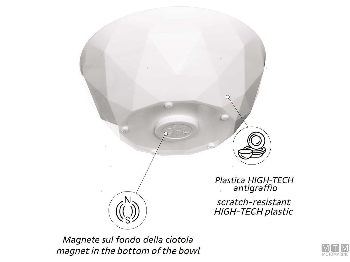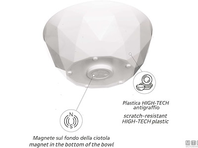 Set di due ciotole in plastica infrangibile Hightech con magnete integrato sul fondo per una perfetta adesione al tappetino metallico o al vassoio della linea Silwy. Lavabili in lavastoviglie (modalità ECO) sono perfettamente impilabili e non creano rumori di sfregamento.