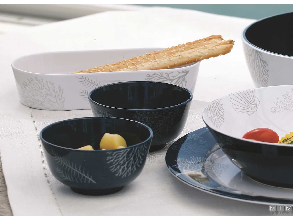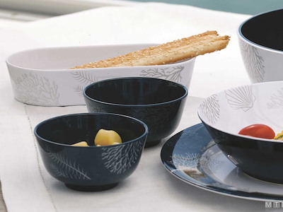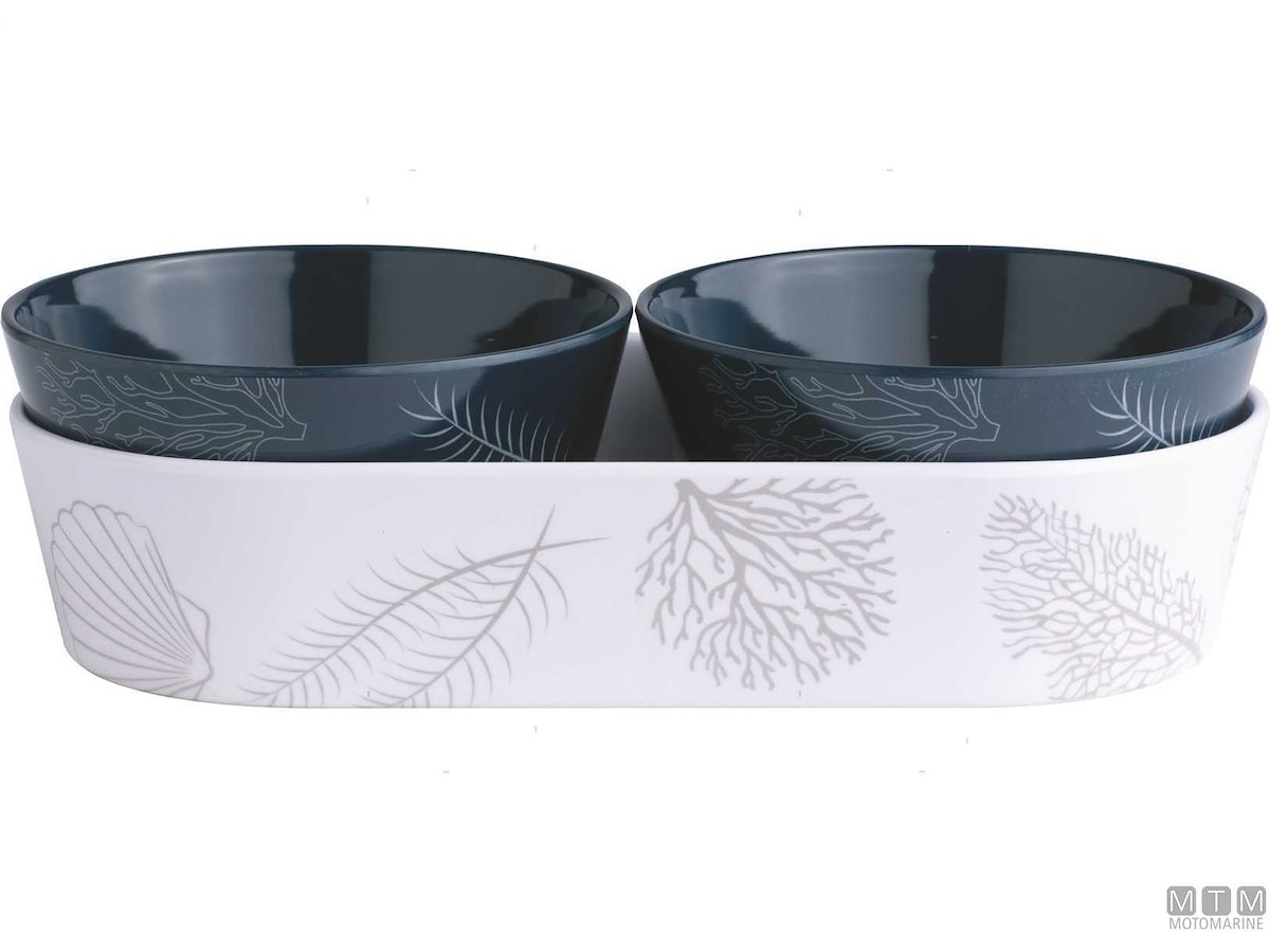 Set di 2 ciotole snack con sottopiatto rettangolare con decoro Living. In Melamina garantita 100% per uso alimentare. Lavabile in lavastoviglie, infrangibile e anti-macchia.