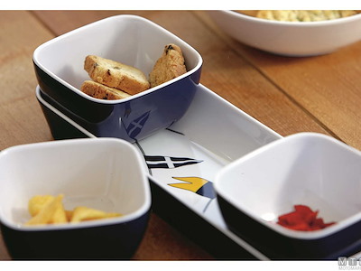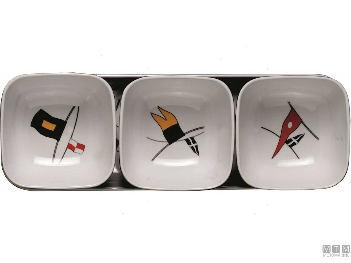 Set di 3 ciotole snack con sottopiatto rettangolare con decoro Regata. In Melamina garantita 100% per uso alimentare. Lavabile in lavastoviglie, infrangibile e anti-macchia.
