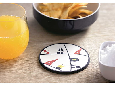 Set sottobicchieri in PVC con decoro Regata e base antiscivolo in confezione da 6 pezzi. Cod.: 5802230Dim cm: ø 10,5Confezione pz: 6