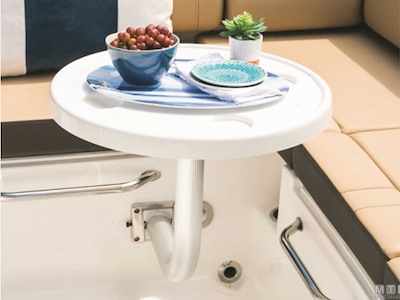 Piano tavolo ovale Garelick completo di supporto per montaggio laterale. Il tavolo è removibile grazie a un semplice meccanismo a scatto integrato sulla base di fissaggio. Supporto diametro 6 cm, altezza 41 cm, base di montaggio 8 x 13 cm.