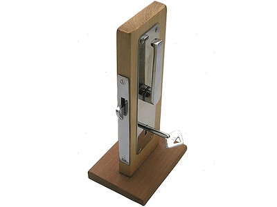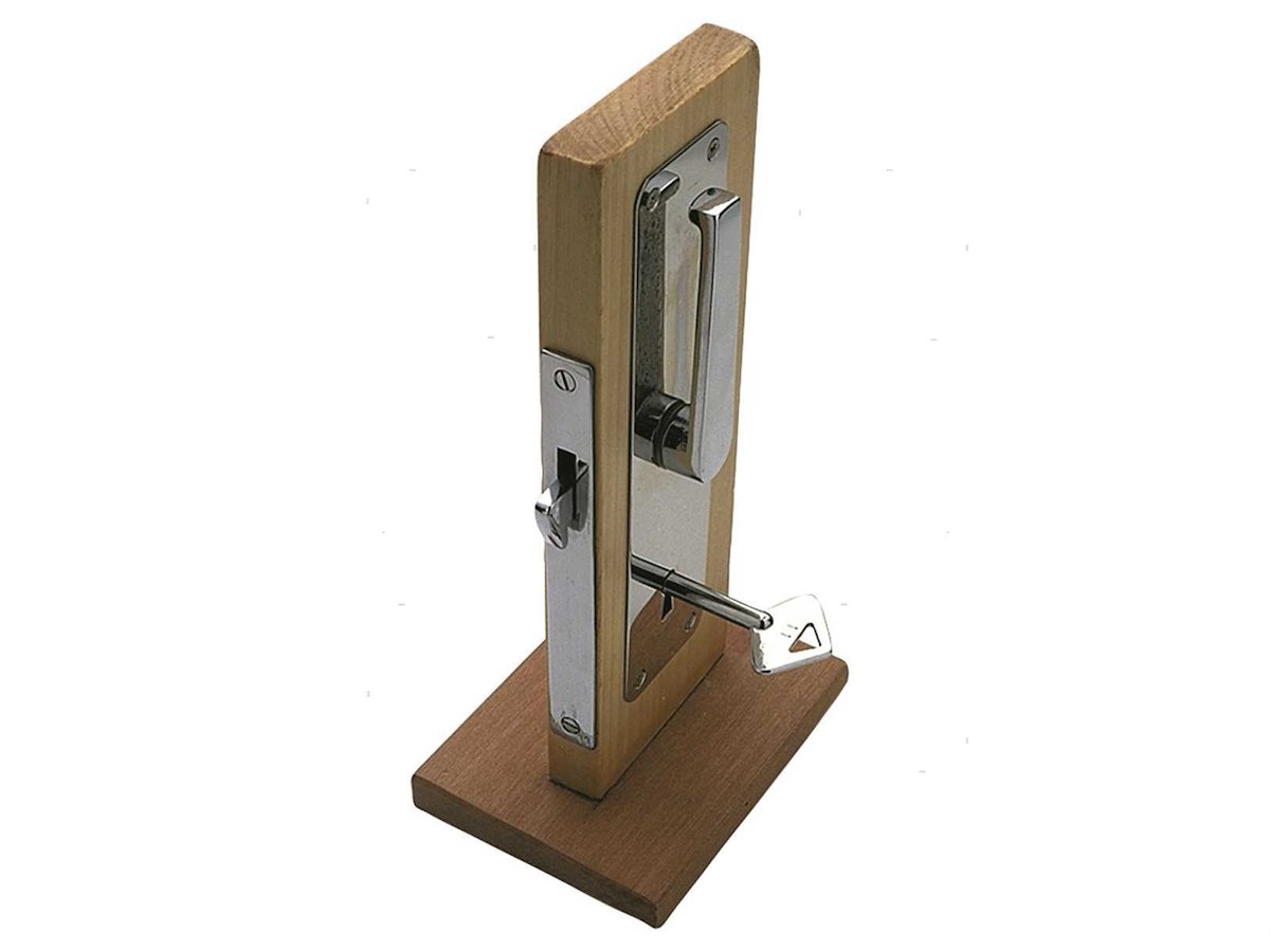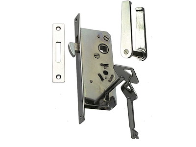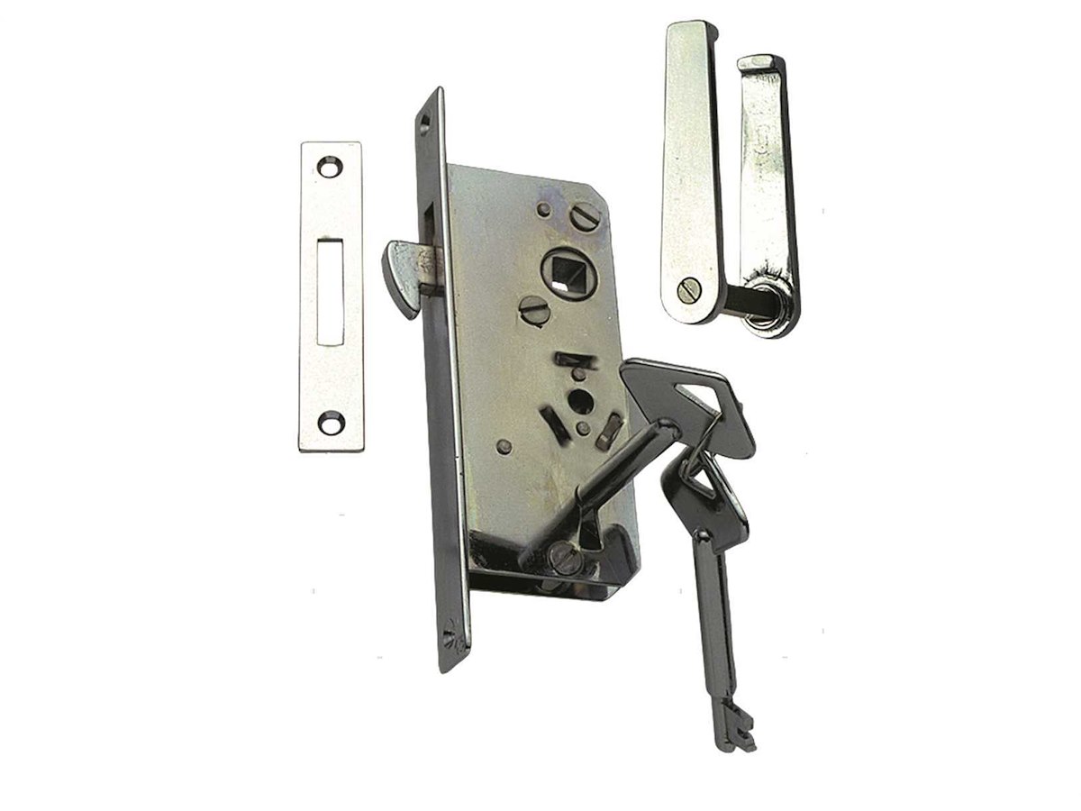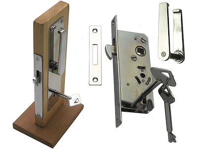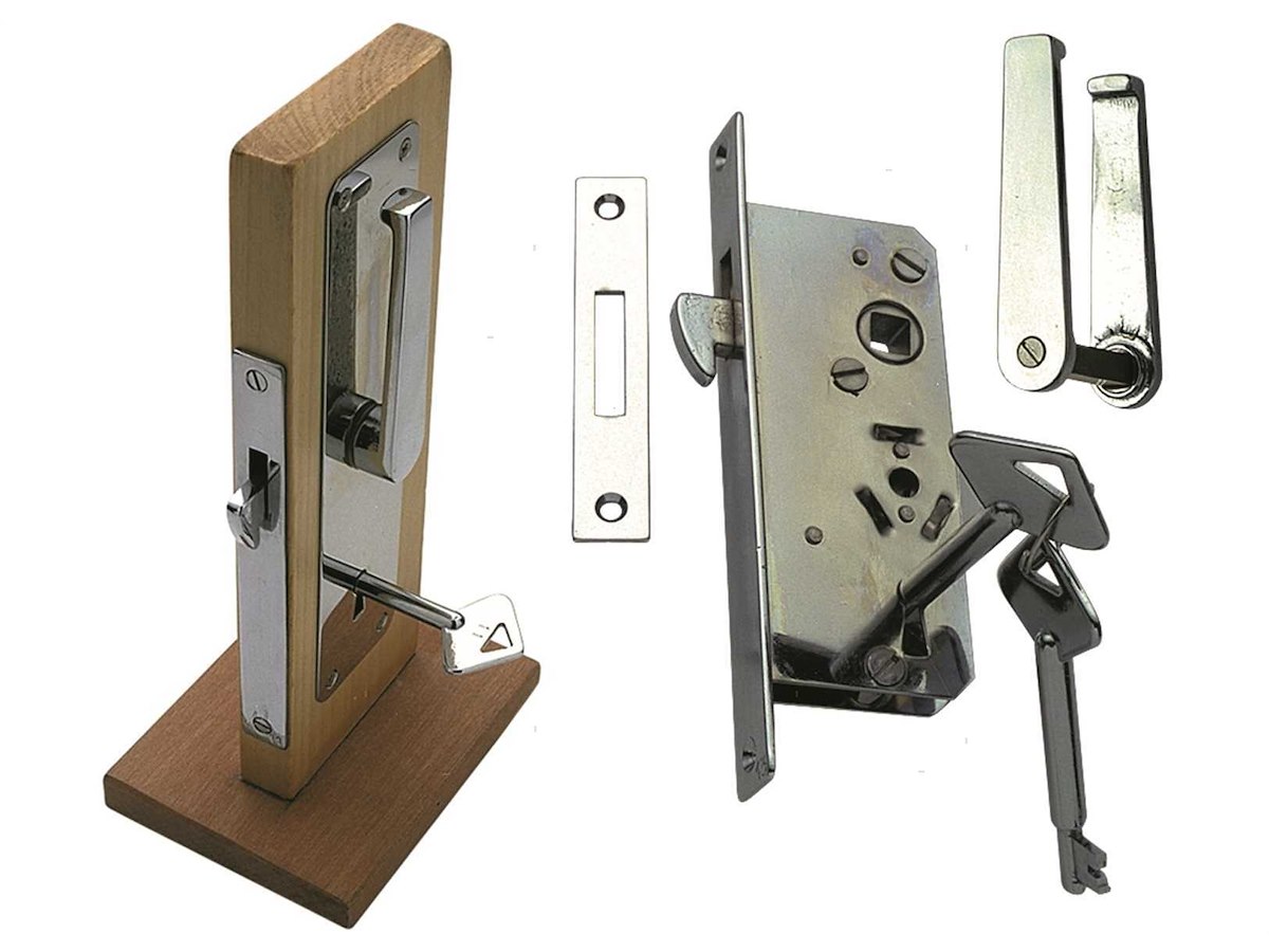 Serratura da infilare per porte scorrevoli completa di maniglie, chiavi, scontro piano e placche in Acciaio Inox. Componenti inossidabili. Mano universale DX/SX.