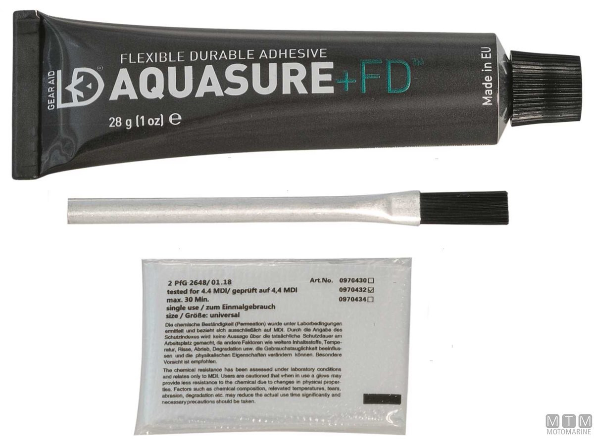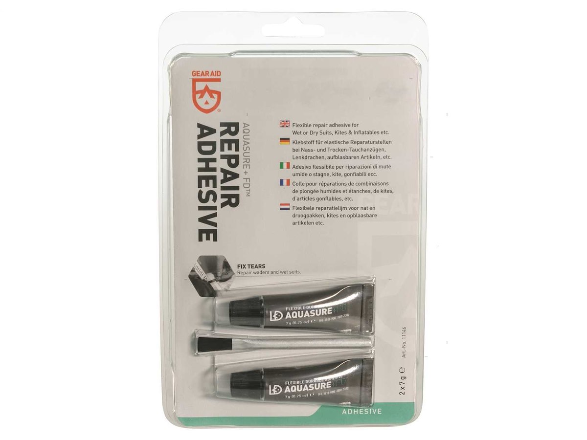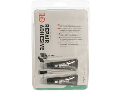 Adesivo sigillante in gomma poliuretanica per riparazioni impermeabili permanenti di forature, strappi e cuciture di attrezzature da pesca e sport acquatici, kayak, mute, stivali, tende e cerate. Flessibile, può ricostruire piccole parti mancanti senza l'uso di toppe.