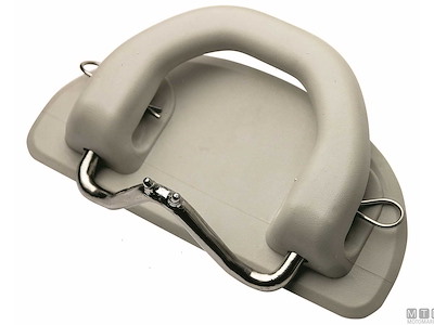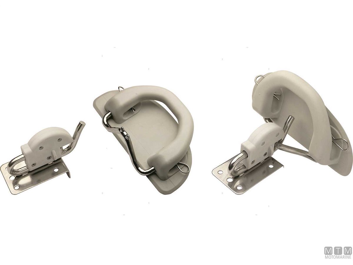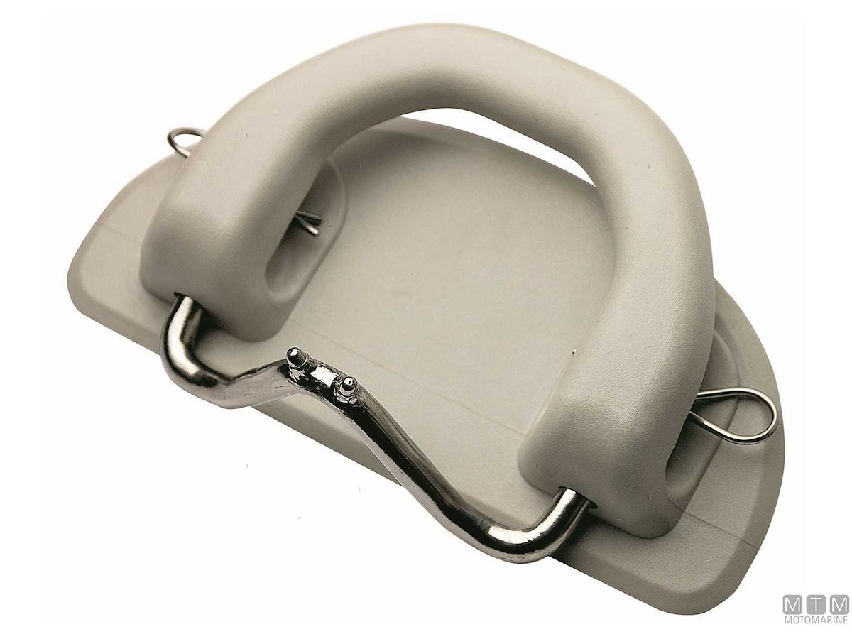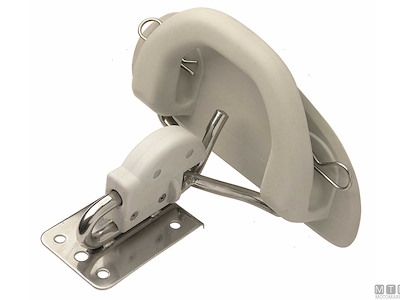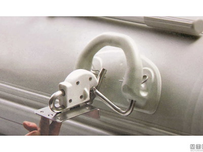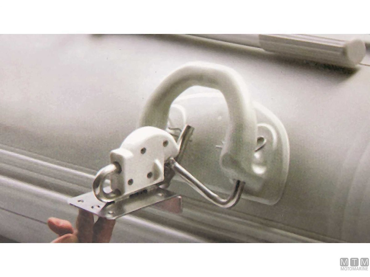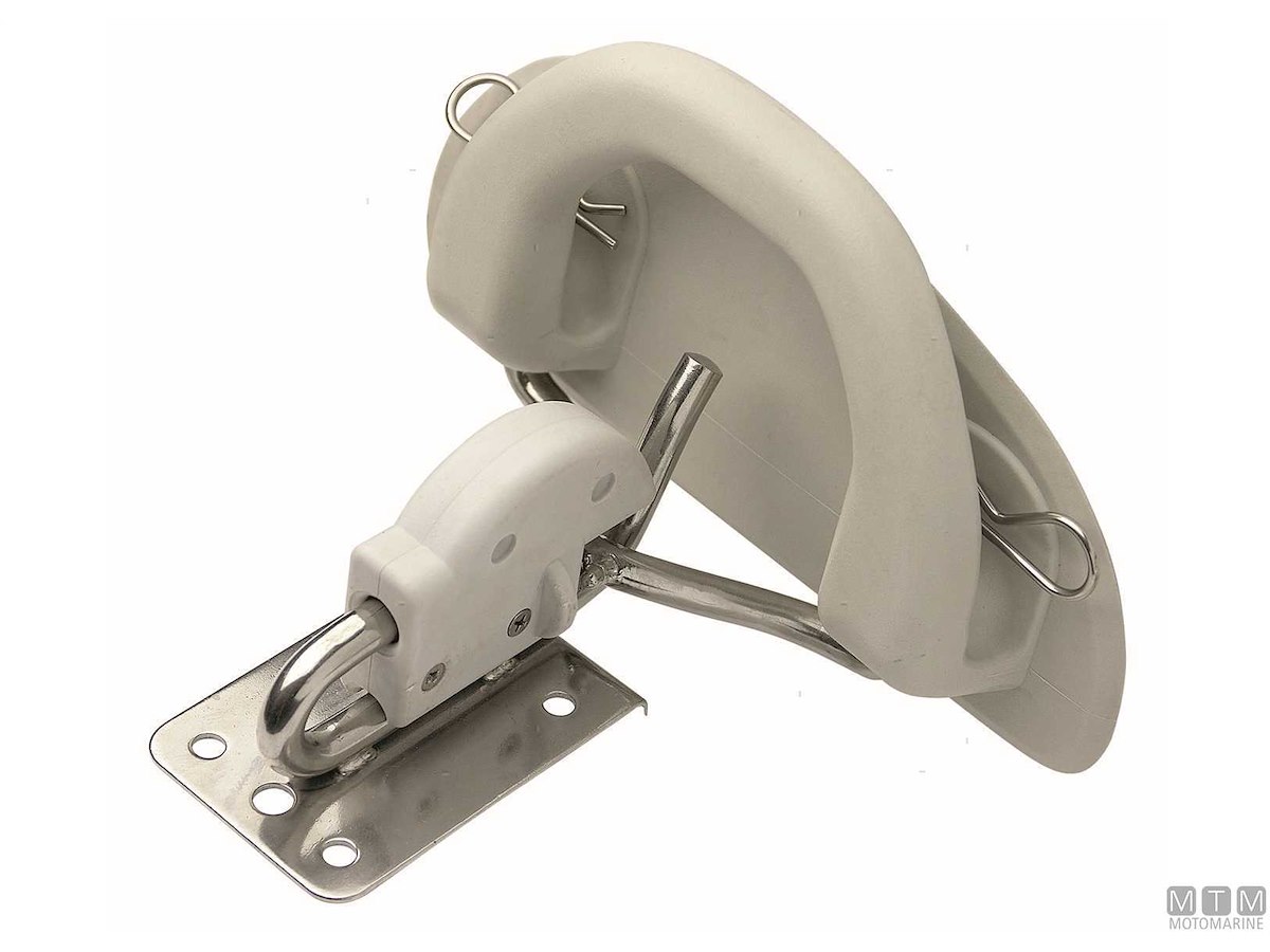 Sistema basculante da montare sulla piattaforma di poppa per issare a bordo battelli gonfiabili come pram o tender di servizio. Comprende 2 piastre di aggancio in Acciaio Inox e 2 placche maniglia in Gomma da fissare al gommone.
