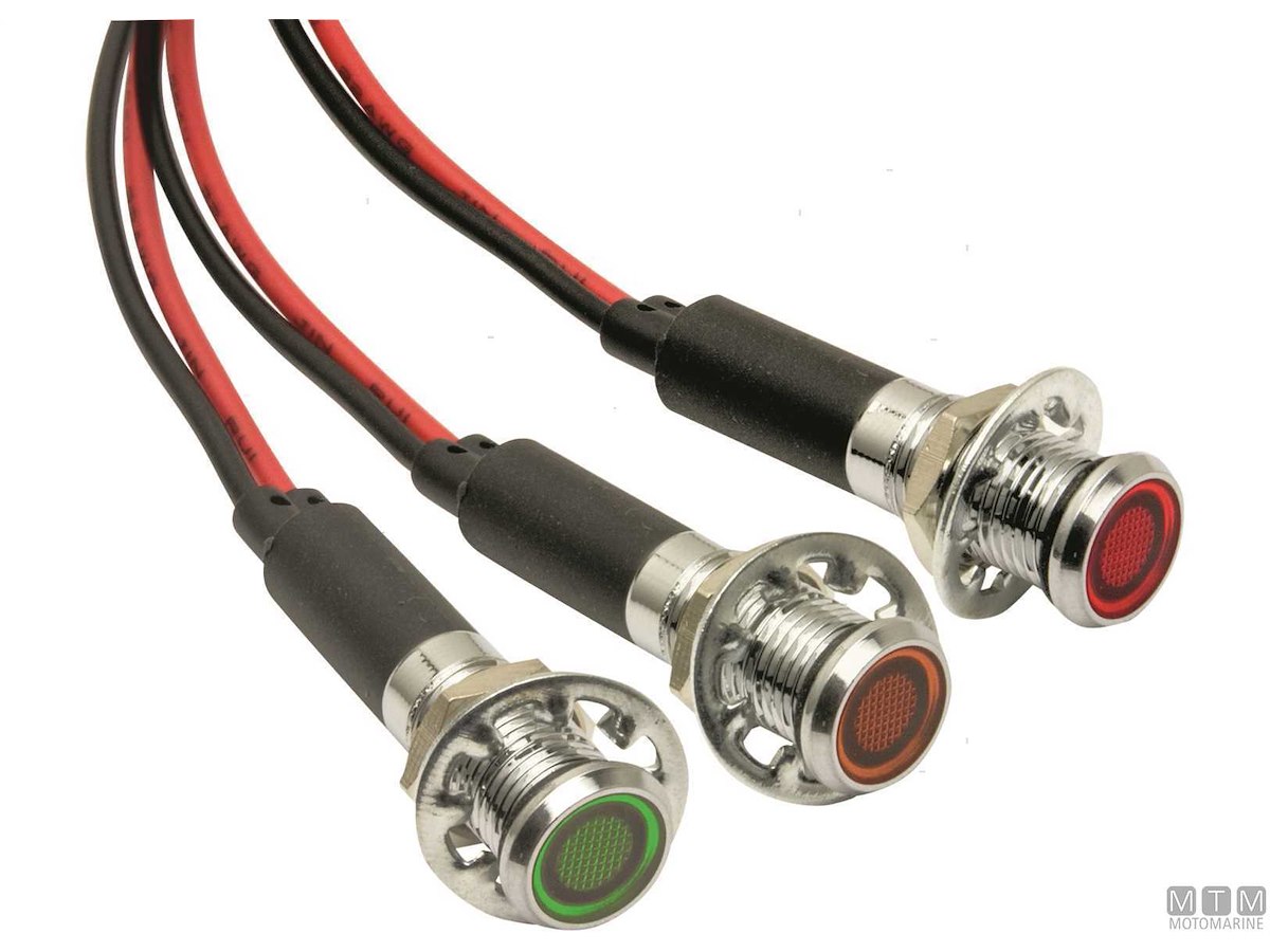 Spie stagne LED 12V in Ottone Cromato. Complete di dado, guarnizione e rondella di sicurezza. Spessore pannello max 13 mm.