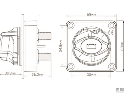 Staccabatterie con manopola e perni M10 in rame stagnato, montaggio a incasso. Collaudato per i valori di corrente e conforme ai requisiti di antideflagranza.