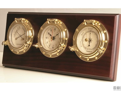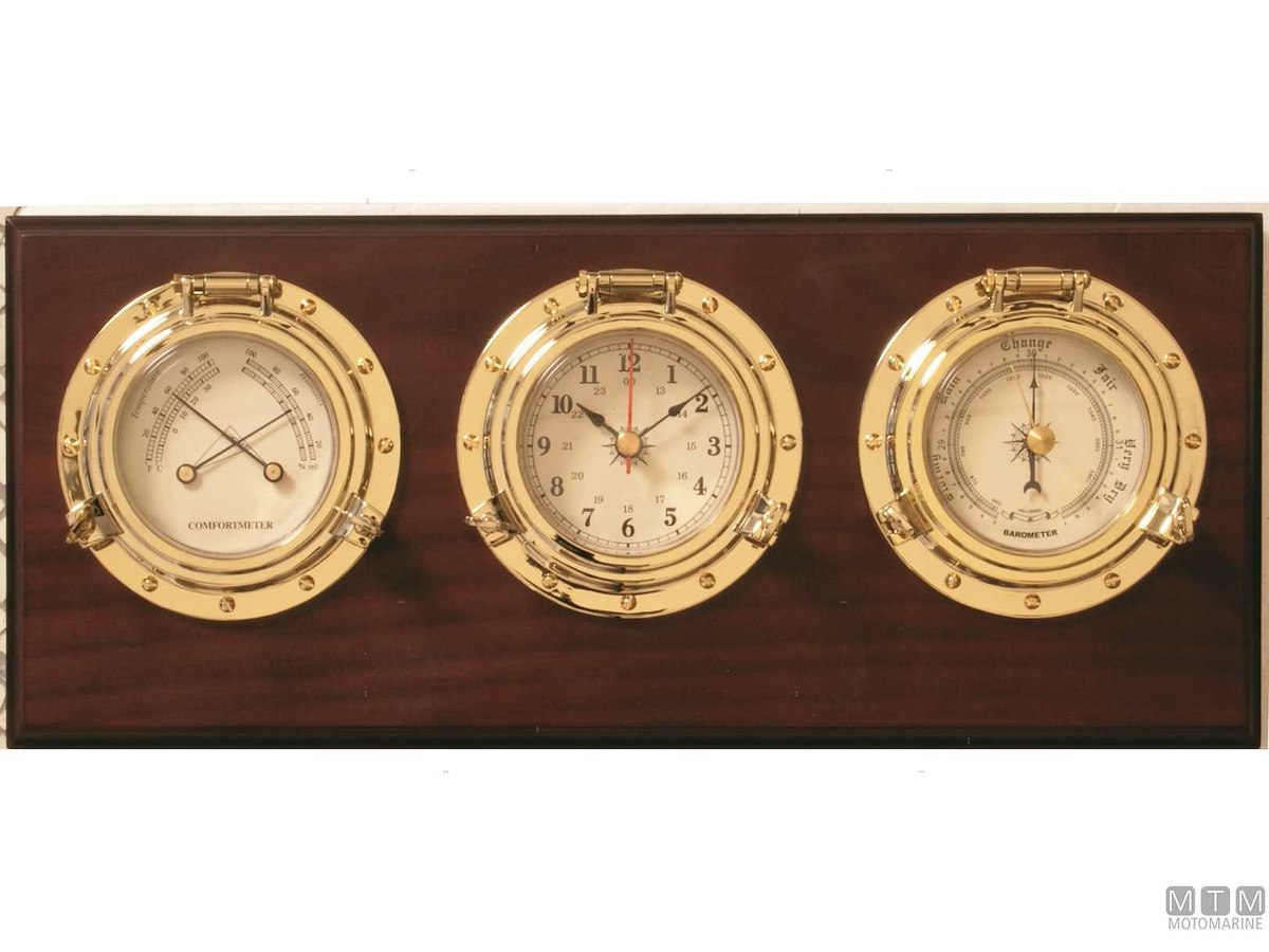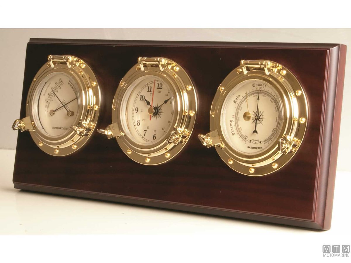 Stazione meteo con strumenti ottonati in Zirconio lucidato a specchio. Barometro, orologio e termo/igrometro montati su tavoletta in legno pregiato. La stazione orizzontale è dotata di basetta per appoggio su tavolo. Diametro strumenti 100 mm.