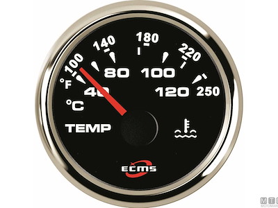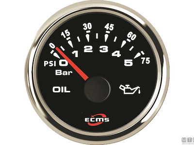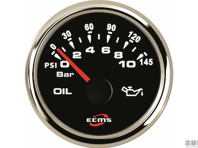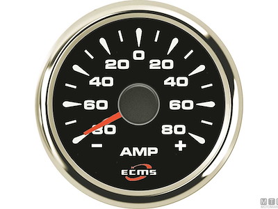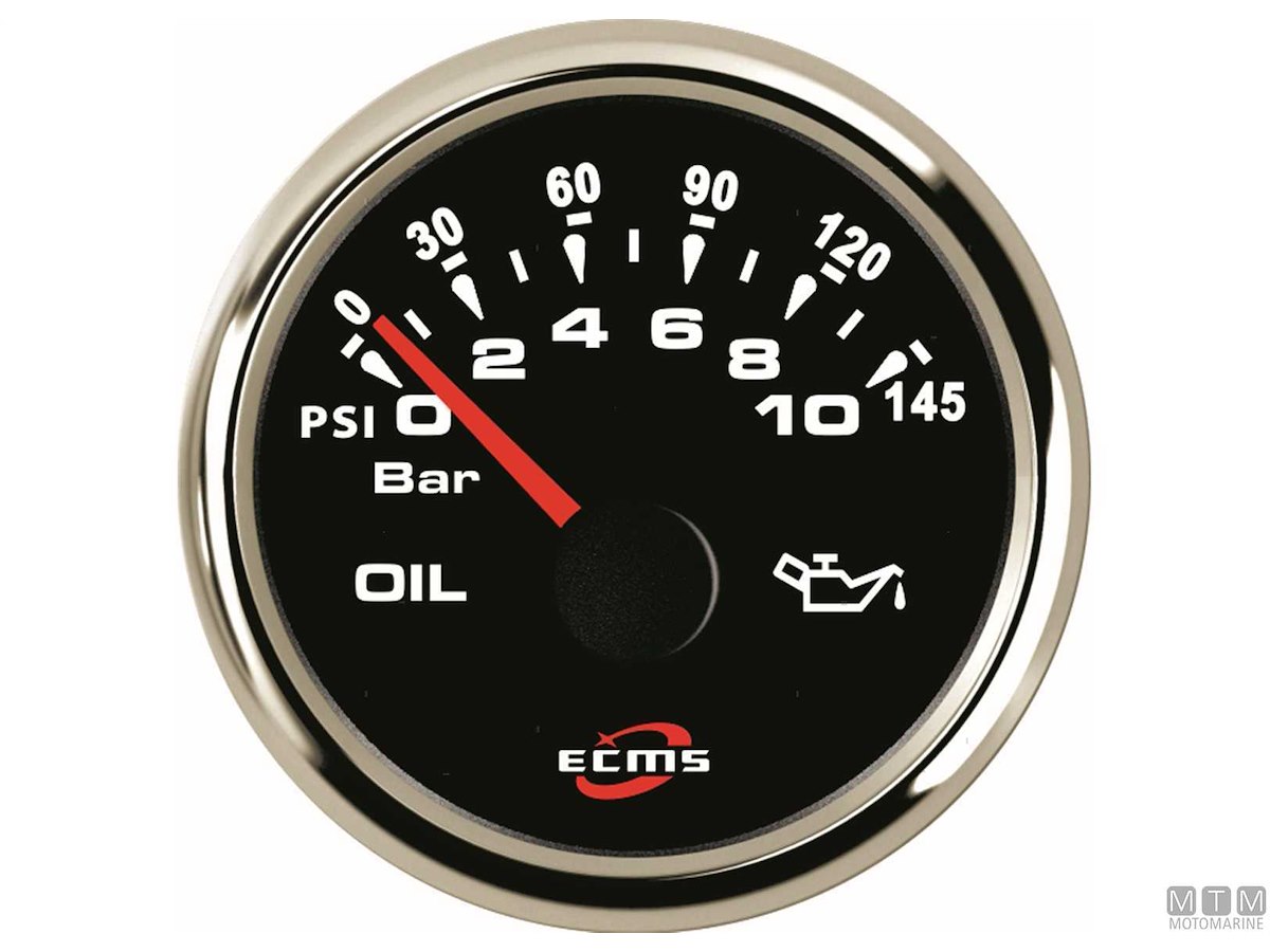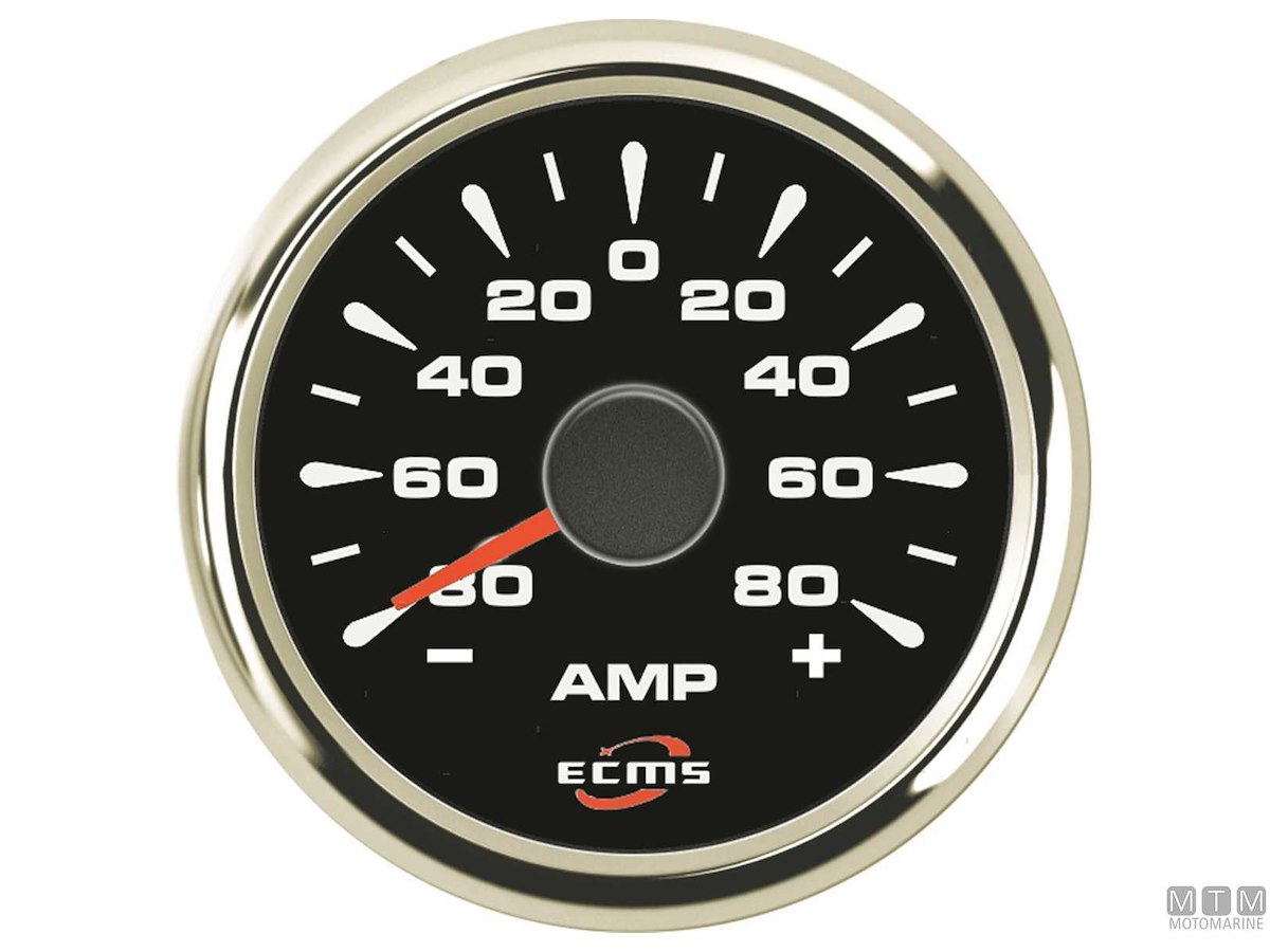 Strumentazione Ecms Black Chrome 9-32V completa di cavetti con connettore Molex, cornice in Acciaio Inox 316 con finitura cromata e frontalino impermeabile IP67 con lente bombata anti-appannamento. Quadrante retroilluminato con luce LED personalizzabile in vari colori.  Gli indicatori di livello si possono impostare su qualsiasi valore di impedenza tramite il tasto posteriore di configurazione. Sono pre-impostati sul valore standard 0-190 Ohm.  Gli indicatori pressione olio da 5 e 10 bar sono compatibili con sensori standard (10-180 Ohm), mentre il 30 bar è compatibile solo con sensori elettronici (0,5-4,5V).  Gli amperometri sono completi di sensore (shunt) per misurare la corrente.
