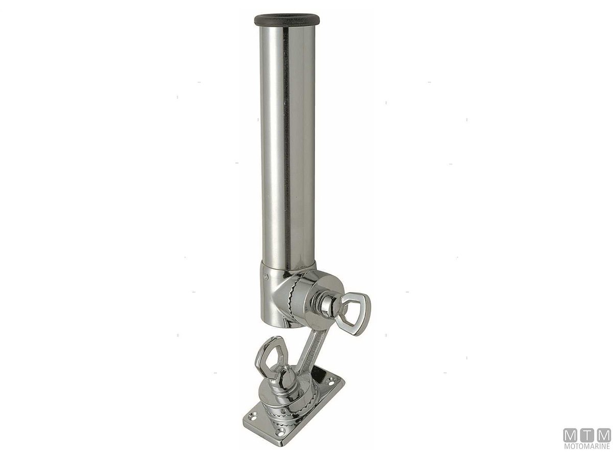 Supporto portacanne orientabile in Ottone Cromato con base piana a doppio snodo e boccola in gomma a protezione della canna.