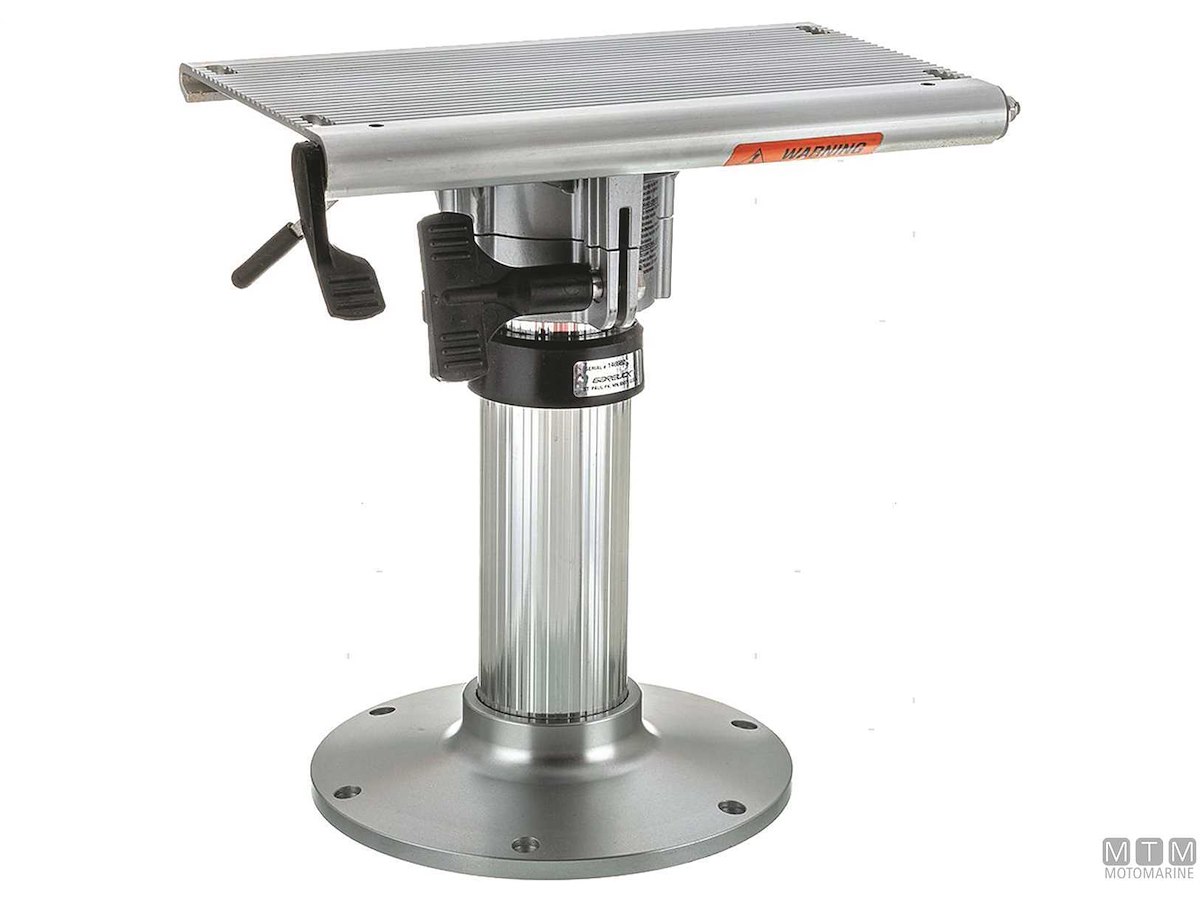 Supporto sedile Garelick in Alluminio Anodizzato con altezza regolabile a gas e testa girevole con slitta avanti-indietro. Diametro base 230 mm, dimensioni slitta 200 x 330 mm.