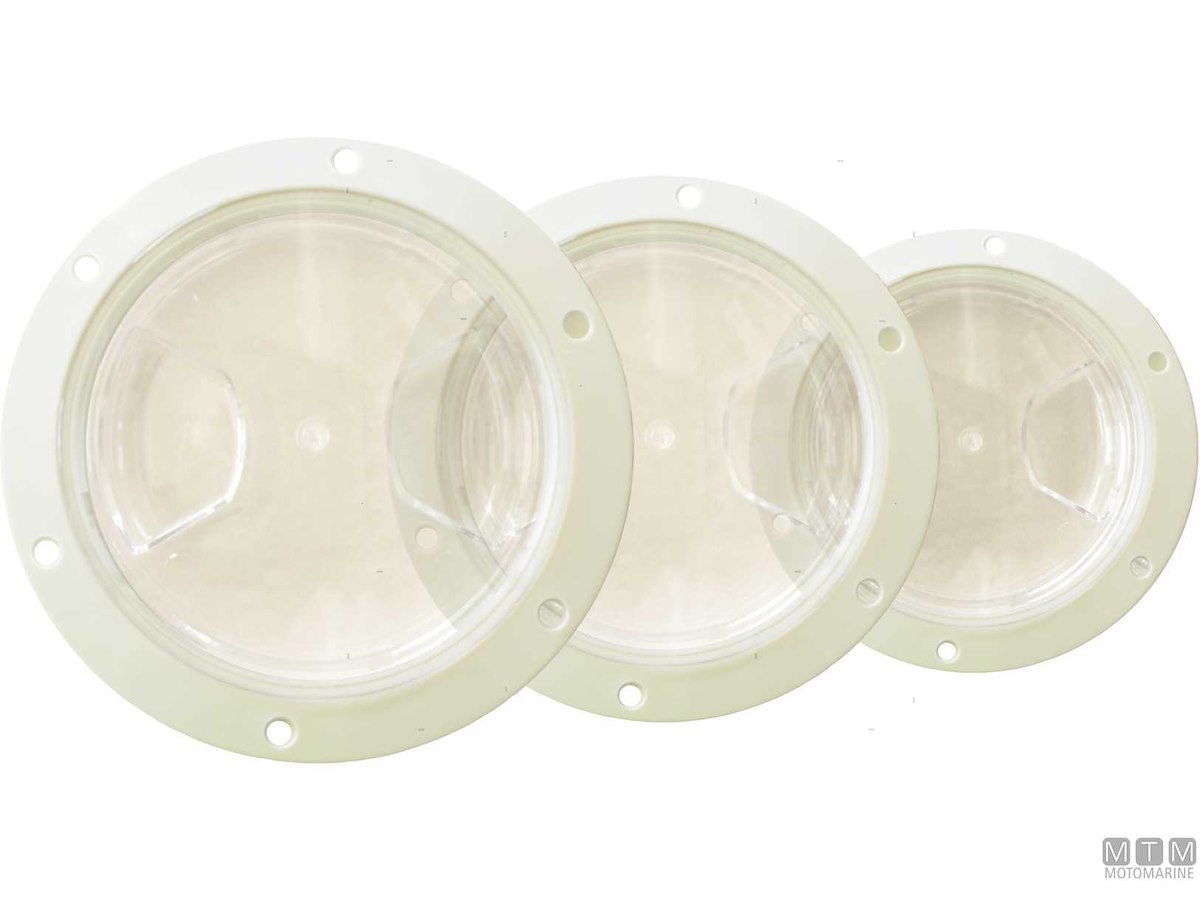 Tappo ispezione stagno con chiusura a vite e guarnizione O-Ring. Coperchio in Plexiglass trasparente per una rapida ispezione visiva.