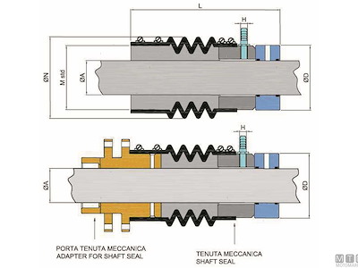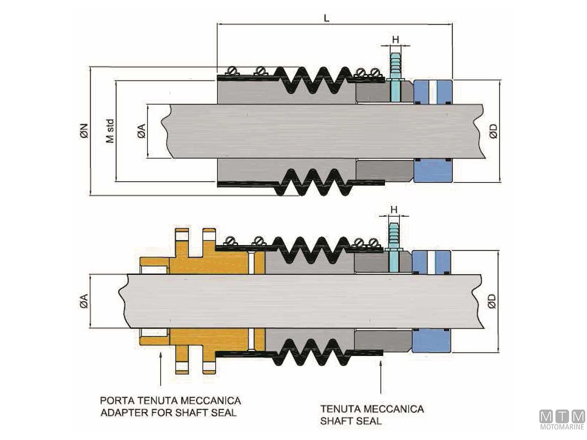 Tenute meccaniche di alta precisione e qualità in materiale combinato Acciaio Inox 316 e Grafite, di facile installazione e manutenzione. La tenuta meccanica avviene nel perfetto contatto planare tra l’anello in Acciaio Inox e la parte in Grafite. L’anello in Acciaio Inox viene fissato con grani sull’asse porta elica (pertanto ruota insieme all’asse), mentre la parte in Grafite rimane ferma sulla tenuta. Le tenute meccaniche possono essere installate direttamente sul tubo astuccio con il manicotto di Gomma vincolato da fascette. La misura standard che attacca il manicotto di gomma al tubo astuccio e’ pari a 113 mm, ma attraverso riduzioni le tenute meccaniche possono essere installate anche su tubi astucci aventi dimensioni pari a 87 mm o misure in pollici da 3”1/4 e 4”. Puo’ essere corredata da un porta tenuta in Bronzo completo di boccola idrolub che va fissato a paratia (vedi codice 4900635<>4900680).