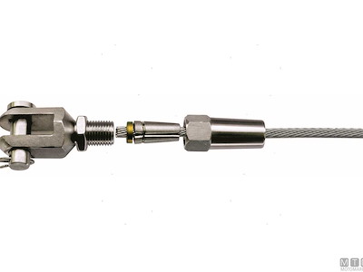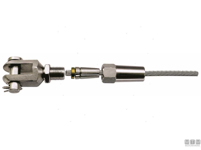 Terminali rapidi in Acciaio Inox AISI 316 con forcella.Tenuta eccezionale pari al carico di rottura del cavo.Facili da montare, basta inserire il cavo d'acciaio nel terminale e il mandrino lo cattura automaticamente. Adatti per tutti i tipi di cavi in acciaio (19/49/133 fili).