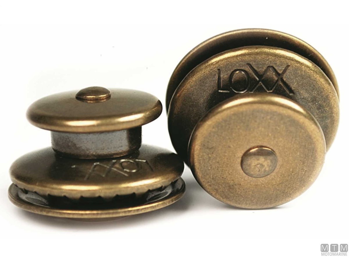 Teste bottone di qualità superiore originali tedesche Loxx. Corpo in Ottone antichizzato o placcato Oro, molla in Acciaio Inox. Ideali per barche classiche e per interni eleganti e raffinati.