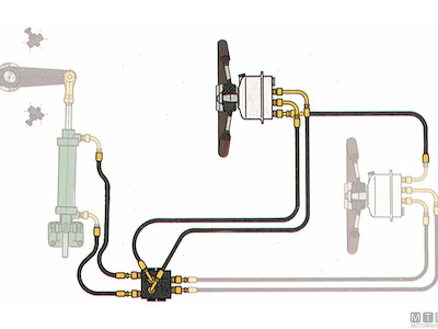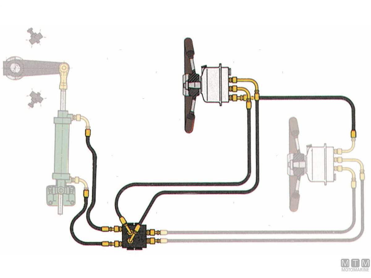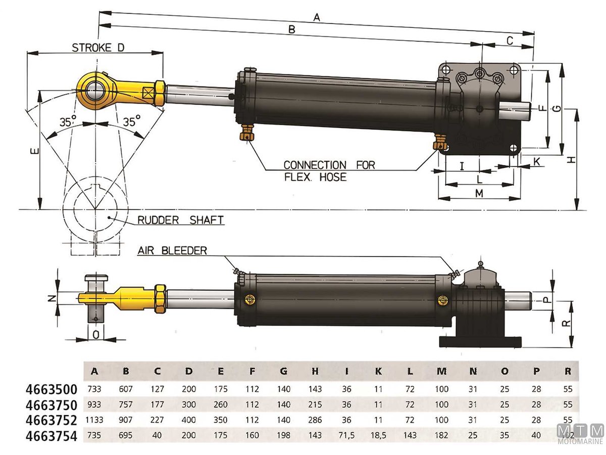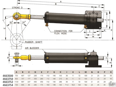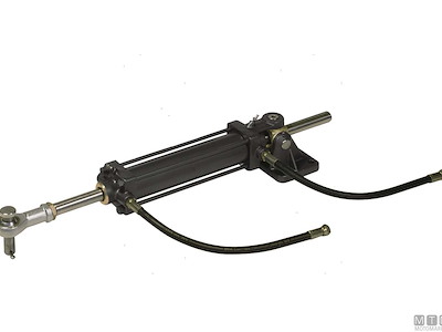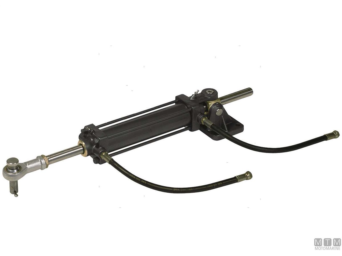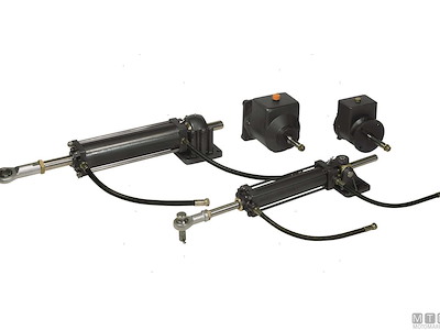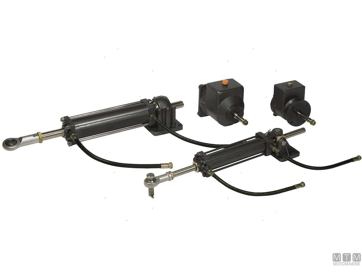 Timonerie idrauliche per imbarcazioni da lavoro. Cilindro completo di tubo flessibile con attacchi filettati femmina 1/2" per essere raccordati su tubi di rame 18x15 mm. Va scelto in base al momento torcente massimo del timone. Pompa con raccordi filettati femmina 1/2" e alberino in Acciaio Inox da 1"/25 mm. Va scelta in base al numero di giri che dovrà fare la ruota timone da banda a banda. I valori indicati in tabella sono i giri della ruota timone per ogni cilindro abbinato alla pompa, in ordine di grandezza a partire dal più piccolo.