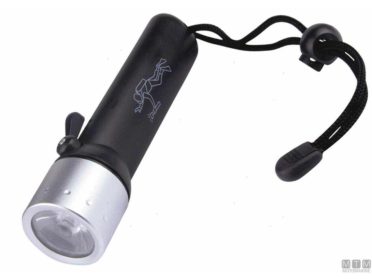Torcia LED impermeabile fino a 20 metri di profondità per uso subacqueo e multiuso. Luminosità 180 Lumen per 12 ore di autonomia.