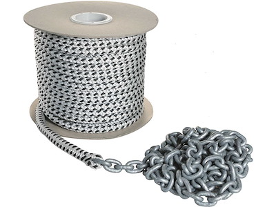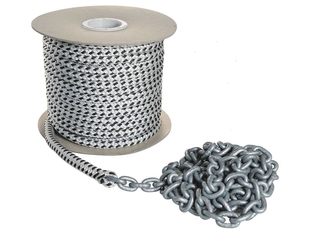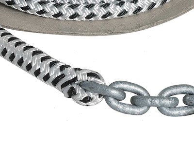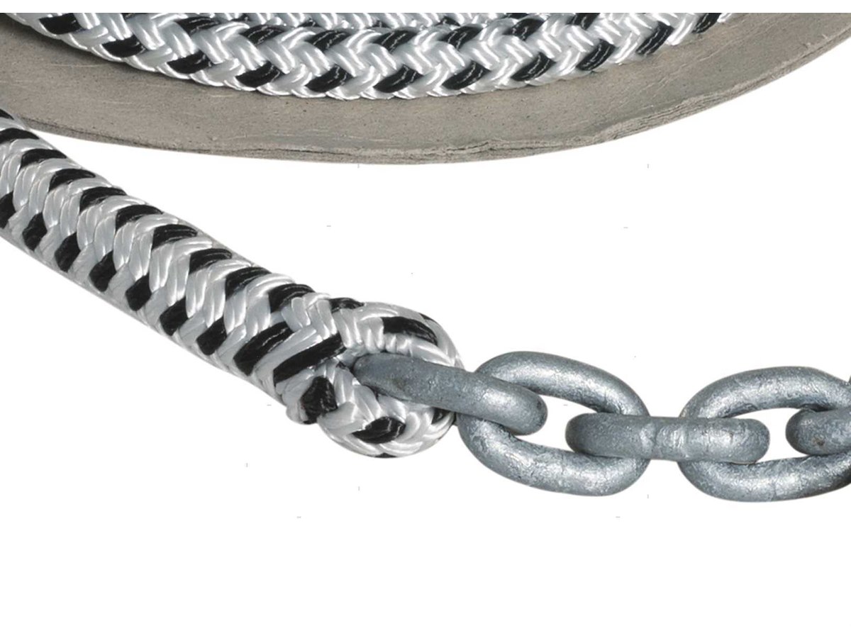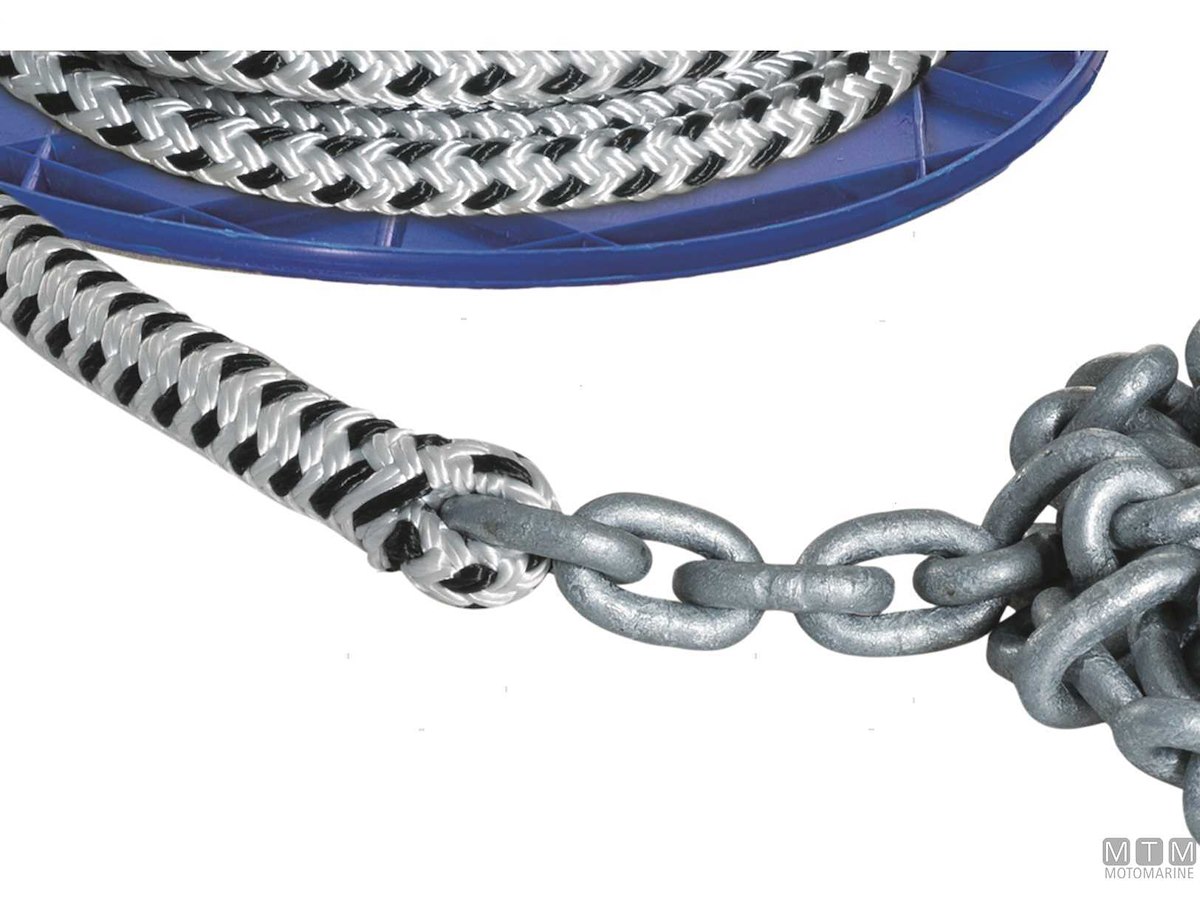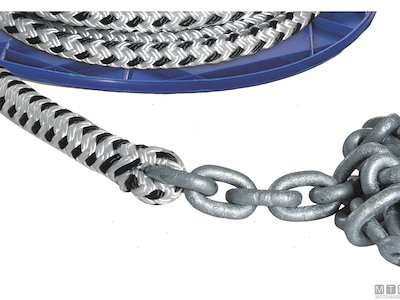 Sistema treccia/catena per ancora pronto per l'uso con impiombatura a sagoma perfetta. Catena calibrata DIN766-G40 in Acciaio Zincato e treccia in Poliestere 16 fusi ad alta tenacità resistente all'abrasione.