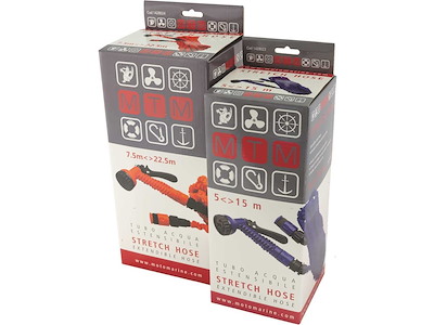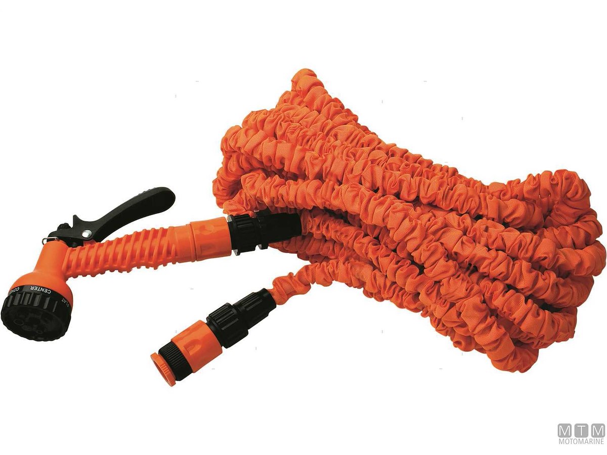 Manichetta estensibile completa di attacchi rapidi e pistola con 7 regolazioni del getto. • Comoda e pratica si allunga durante l'uso e si accorcia da sola una volta chiusa l'acqua • Flessibile non si attorciglia e non si strozza mantenendo la pressione costante • Compatta e leggera è facile da stivare in spazi ristretti • Ricoperta da una robusta guaina di protezione Avvertenze: 1) Non lasciare mai la manichetta in pressione senza aprire il getto della pistola 2) Durante le pause usare la leva di blocco per far uscire un getto di sfogo