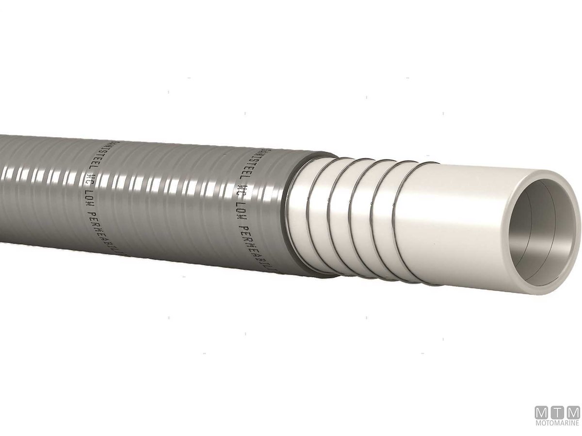 Tubo per scarico acque nere, flessibile e antiodore con struttura a doppio strato e rinforzo ultraflessibile in filo d'acciaio. Il doppio strato è composto da una mescola interna in PVC altamente impermeabile agli odori e una copertura esterna resistente ad agenti atmosferici, ozono e raggi UV.
