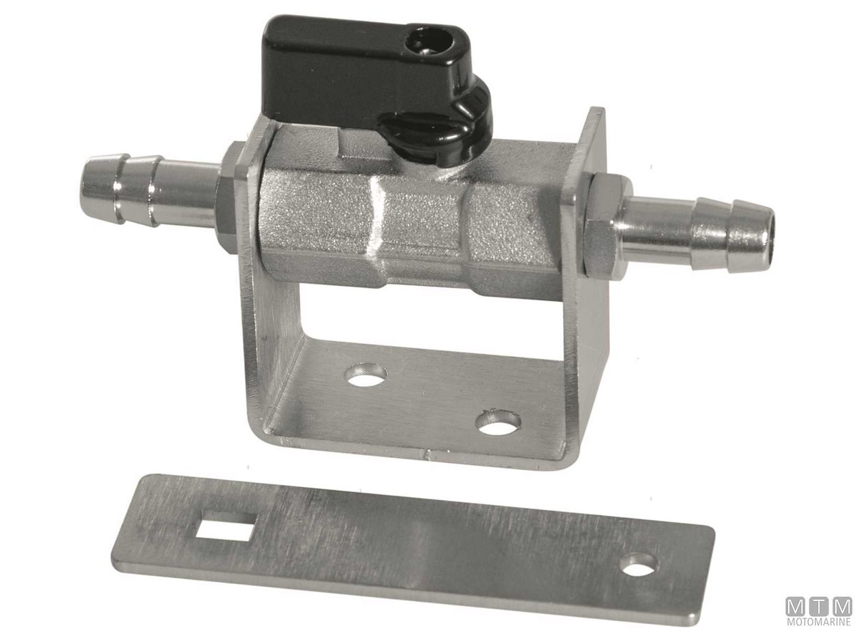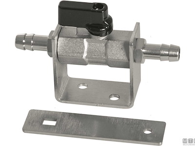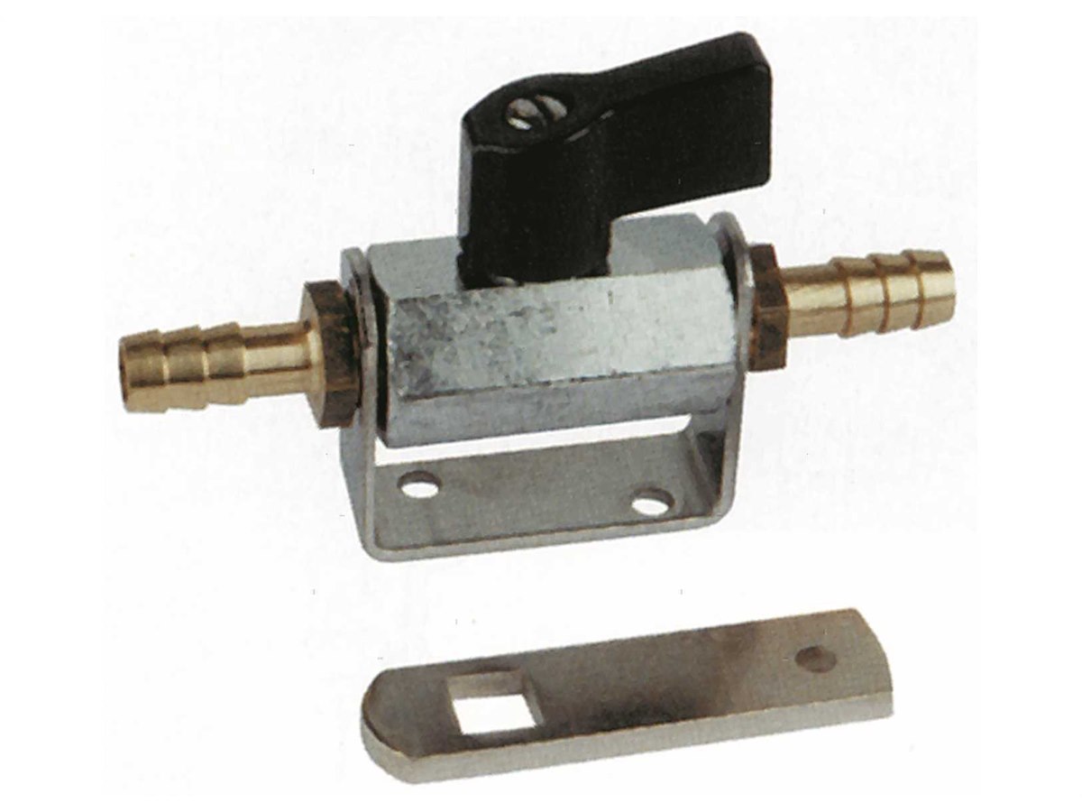 Valvola blocco carburante in Ottone Cromato con due uscite filettate da 1/4" e portagomma da 10 mm. Completa di base montaggio e braccetto per comando a distanza.