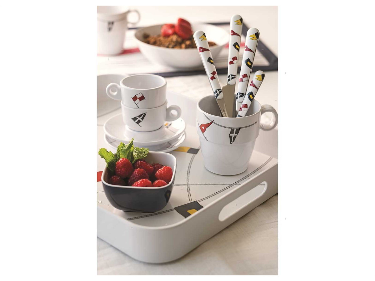 Vassoio rettangolare con decoro Regata. In Melamina garantita 100% per uso alimentare. Lavabile in lavastoviglie, infrangibile e anti-macchia.