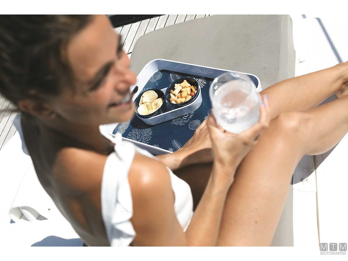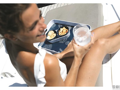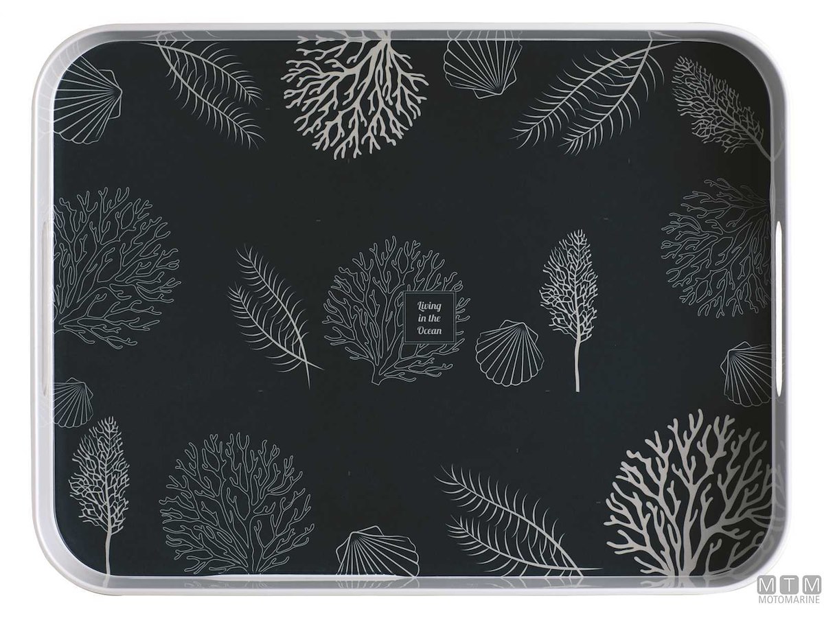 Vassoio rettangolare con decoro Living. In Melamina garantita 100% per uso alimentare. Lavabile in lavastoviglie, infrangibile e anti-macchia.