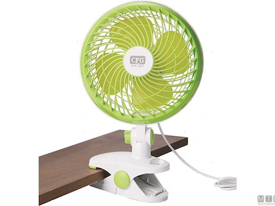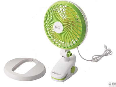 Ventilatore portatile da appoggio con base, morsetto ed attacco a parete. Testa reclinabile con motore a due velocità, alimentazione USB, consumo 3W.
