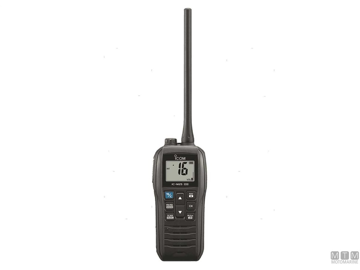 VHF portatile ICOM IC-M25E Evo impermeabile IPx7 galleggiante con suono di allarme e luce rossa di segnalazione LED. Impugnatura ergonomica con display LCD e tasti retroilluminati, microfono a cancellazione di rumore, funzioni dual/tri watch, autoscan e AquaQuake per rimuovere l'acqua dalla griglia. Tasto dedicato canale 16, 5W potenza RF e 11 ore di autonomia. Completo di batteria Li-Ion, caricabatterie, cavo micro USB, clip da cintura, antenna, cinghiello e manuale. Dimensioni: 57 x 31 x H134 mm.