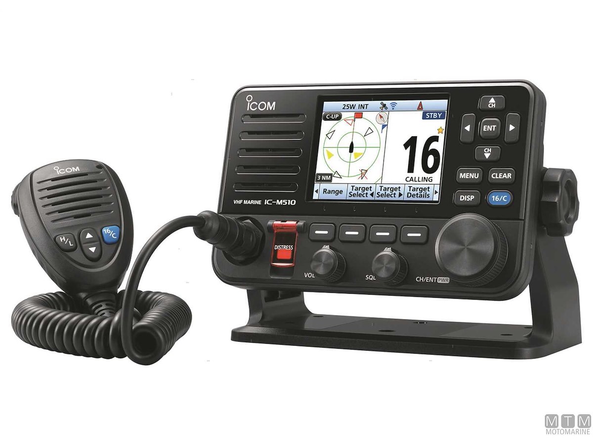 VHF/DSC classe D ICOM IC-M510E 12V ad installazione fissa con microfono e ricevitore GPS esterno. Con l'interfaccia opzionale wireless box CT-M500 può essere controllato da stazione remota o smartphone tramite app gratuita dedicata. Display LCD TFT a colori da 4.3", cassa impermeabile IP68, connettività NMEA0183 (NMEA2000 WLAN con wireless box CT-M500), funzioni di navigazione con waypoint, sirena anti-nebbia, dual/tri watch, accesso diretto canale 16, cancellazione del rumore (ANC), TAG e AquaQuake per il drenaggio dell’acqua. Il microfono opzionale Commandmic HM-229B permette di controllare tutte le funzioni del VHF da un'altra postazione, viene usato anche come interfono. Completo di antenna GPS con 10 m di cavo, staffa di fissaggio, cavo alimentazione e manuale. Dimensioni: 175 x 71 x H110 mm.