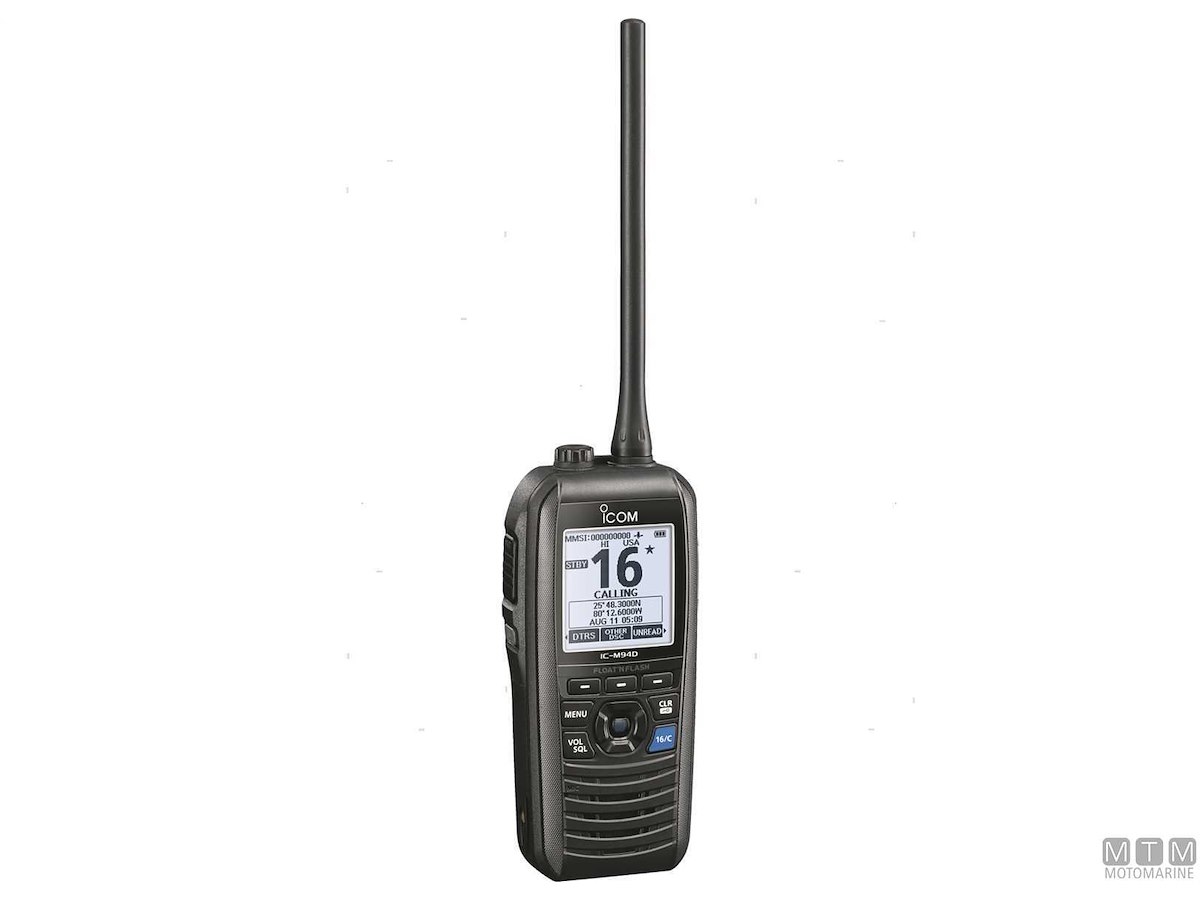 VHF portatile ICOM IC-M94DE con DSC classe H e ricevitori AIS e GPS integrati. Impugnatura snella ed ergonomica, con ampio display LCD e tasti retroilluminati. Impermeabile IPx7 e galleggiante con luce di allarme che si attiva in caso di caduta accidentale in acqua. Dotato di funzione AquaQuake per rimuovere l'acqua dalla griglia, ANC per la cancellazione del rumore, dual/tri watch, tasto MOB, tasto dedicato canale 16 e TAG. Potenza 6W con 10 ore di autonomia. Completo di pacco batterie, caricabatterie da tavolo, clip da cintura, antenna, cinghiello e manuale. Dimensioni: 61 x 44 x H146 mm.