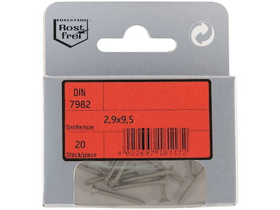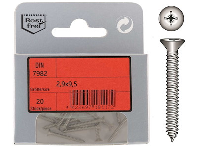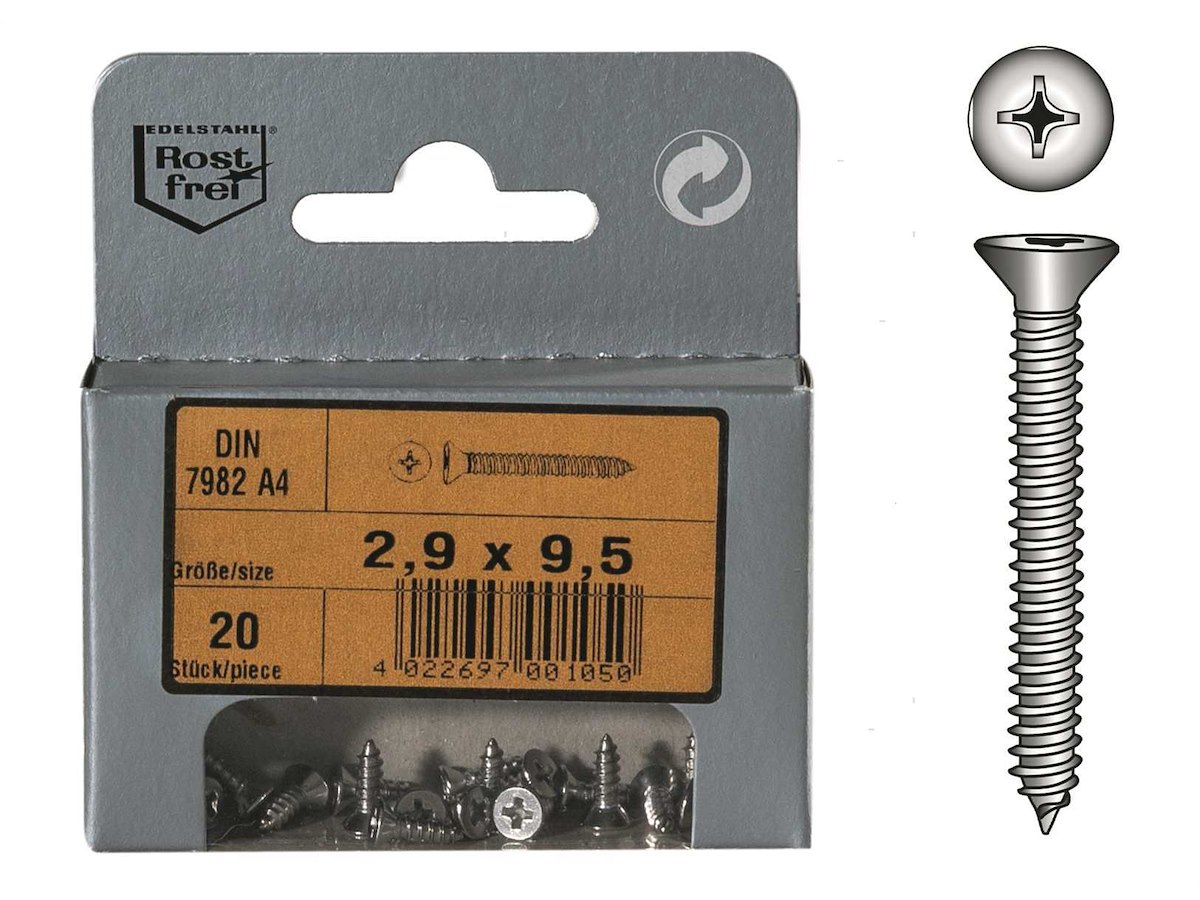Viti autofilettanti con testa piana svasata DIN 7982 in Acciaio Inox A4.In comodi ed eleganti blister.