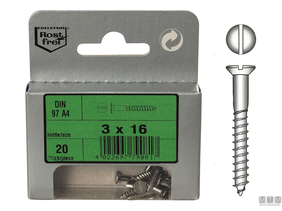 Viti legno testa svasata piana DIN 97 in Acciaio Inox A4. In comodi ed eleganti blister.
