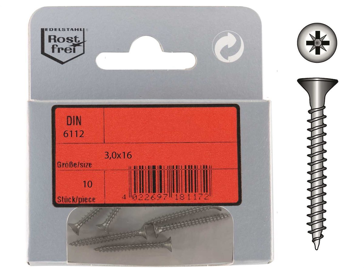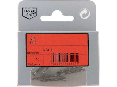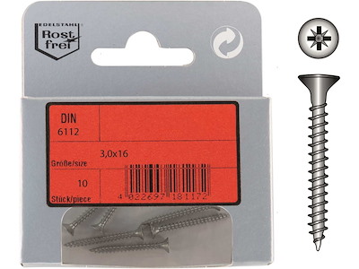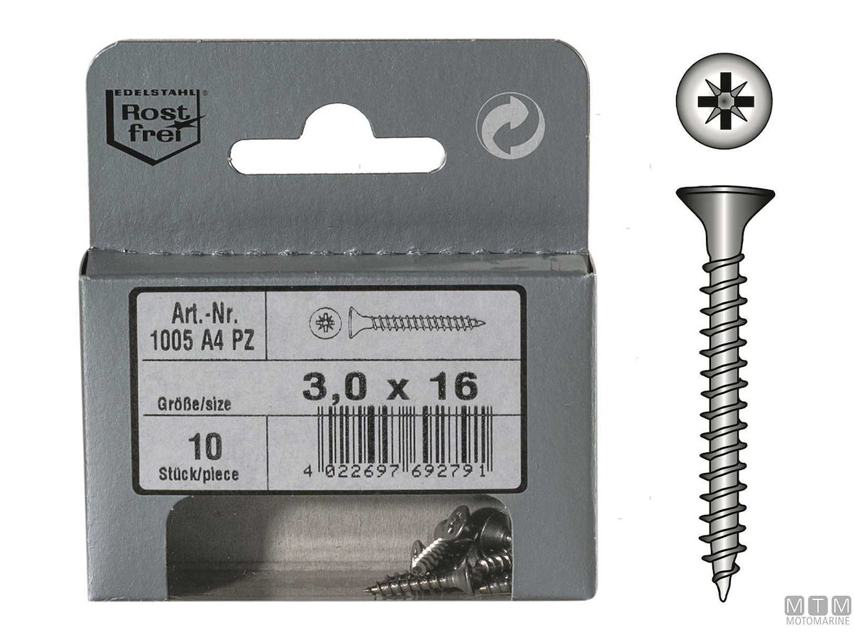 Viti per pannelli truciolari testa svasata piana DIN 6112 in Acciaio Inox A4.In comodi ed eleganti blister.