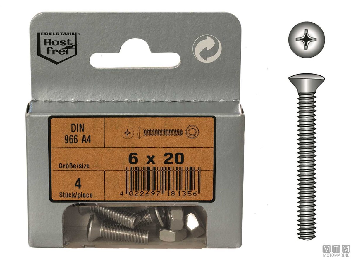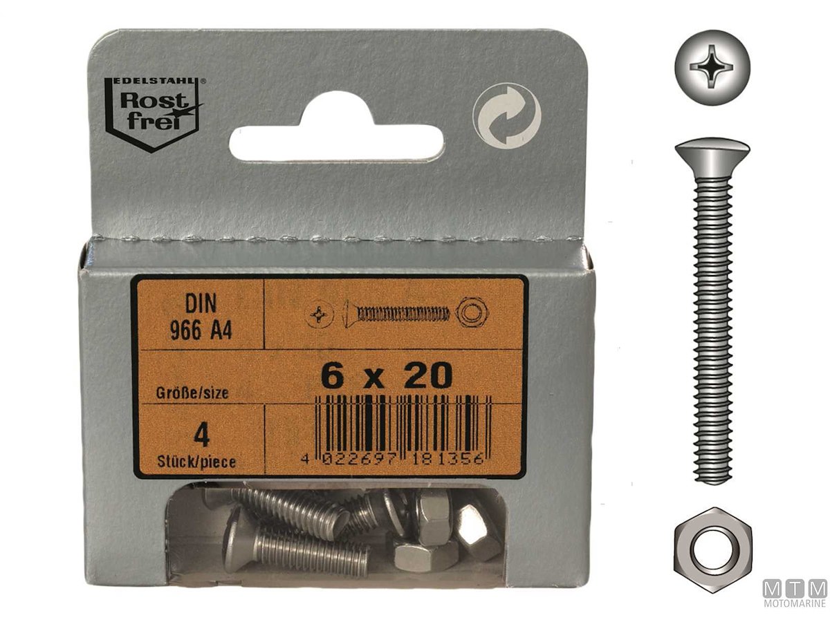 Viti testa svasata con calotta DIN 966 in Acciaio Inox A4. Confezione in Blister completa di dadi.
