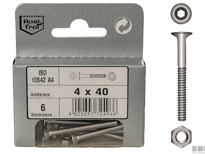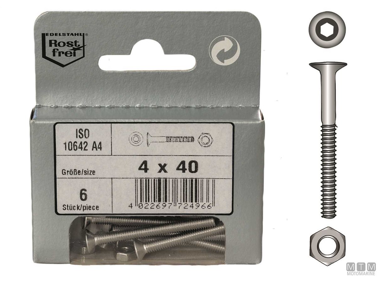 Viti testa svasata piana con cava esagonale ISO 10642 in Acciaio Inox A4. Confezione in Blister completa di dadi.